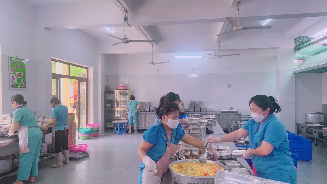 Để đáp ứng các điều kiện về ATTP, khu bếp ăn bán trú cũng đã được trang bị đầy đủ cơ sở vật chất: Bếp ga, tủ cơm, tủ lạnh lưu mẫu thức ăn, dụng cụ đựng thức ăn bằng inox… bếp vận hành theo quy trình một chiều, chia thành các khu riêng biệt như: khu nhập nguyên liệu, khu chế biến thực phẩm tươi sống, khu nấu ăn và khu để thức ăn đã nấu chín. Toàn bộ quá trình chế biến thức ăn, bảo quản thực phẩm được các nhân viên nuôi dưỡng tuân thủ nghiêm ngặt từ khâu tiếp nhận, sơ chế, chế biến đến chia thức ăn, lưu mẫu…