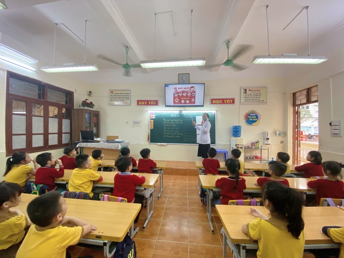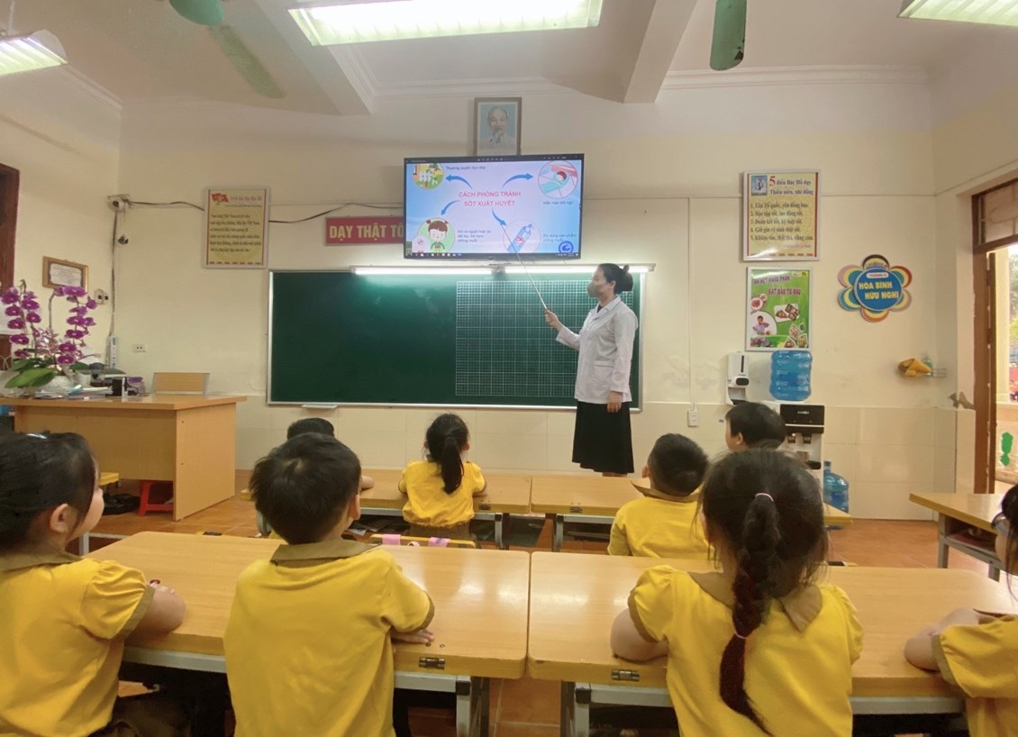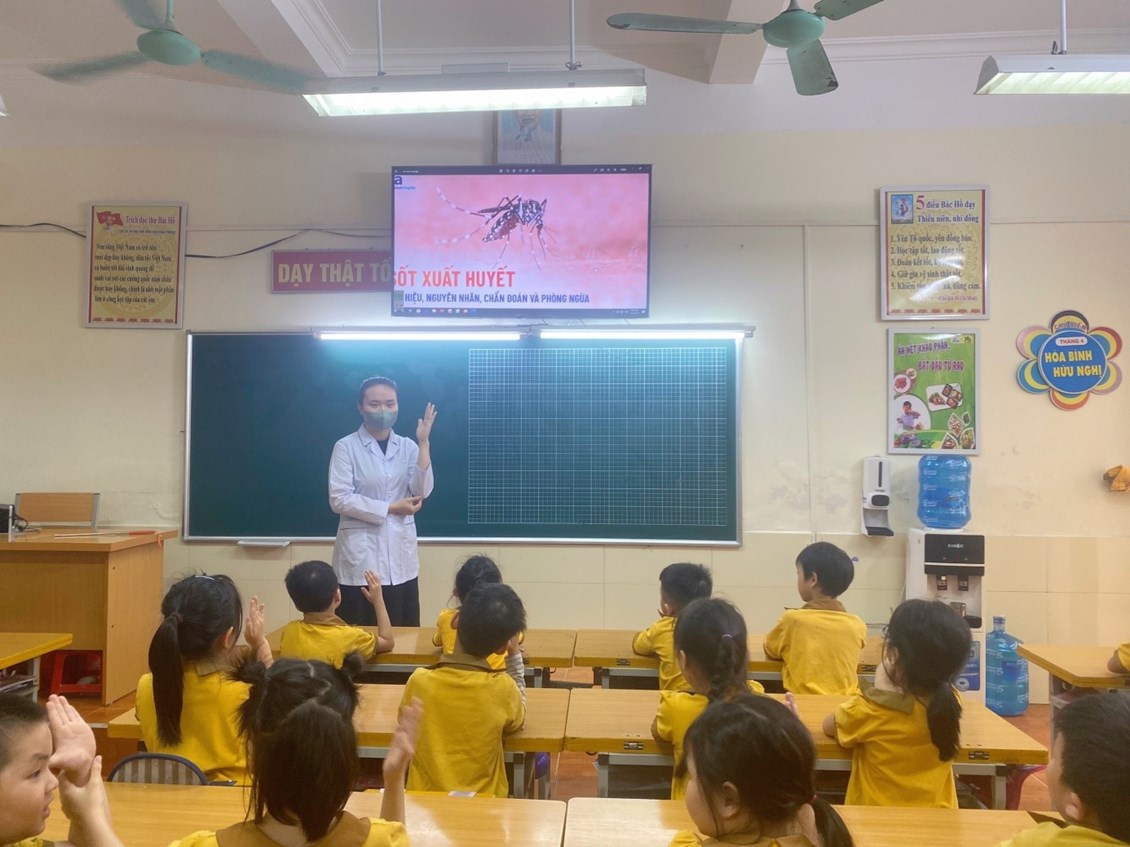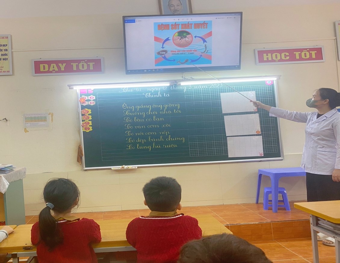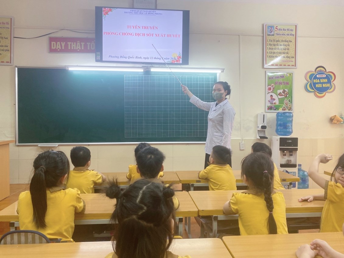 Phối hợp cùng nhân viên y tế phường đến từng lớp học hướng dẫn, tuyên truyền để học sinh nắm được nguyên nhân, dấu hiệu khi mắc bệnh sốt xuất huyết và cúm mùa. Từ đó có biện pháp phòng, chống các dịch bệnh tại nhà và gia đình.