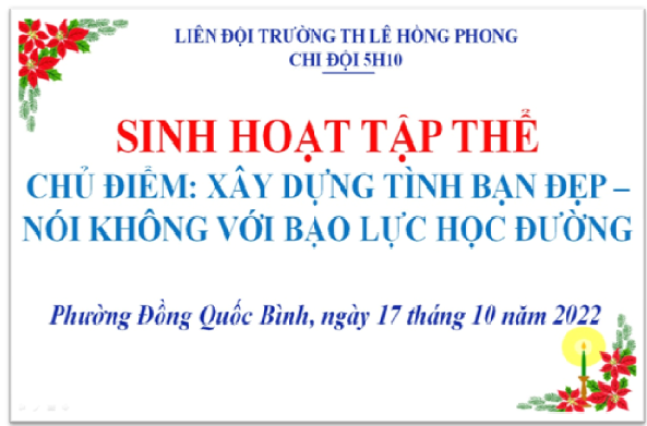 Xây dựng tình bạn đẹp đồng nghĩa với việc không có bạo lực học đường, không có mâu thuẫn và những mối quan hệ tiêu cực trong lớp học, trường học cũng như bên ngoài trường học là hoạt động thiết thực giáo dục thiếu nhi từ các chi đội, sao nhi đồng. Nhận thấy tầm quan trọng của việc xây dựng tình bạn đẹp và phòng tránh bạo lực học đường, ngày 17/10/2022, các lớp nhi đồng, chi đội khối 4, 5 đã tổ chức sinh hoạt lớp với chủ đề "Xây dựng tình bạn đẹp, nói không với bạo lực học đường".